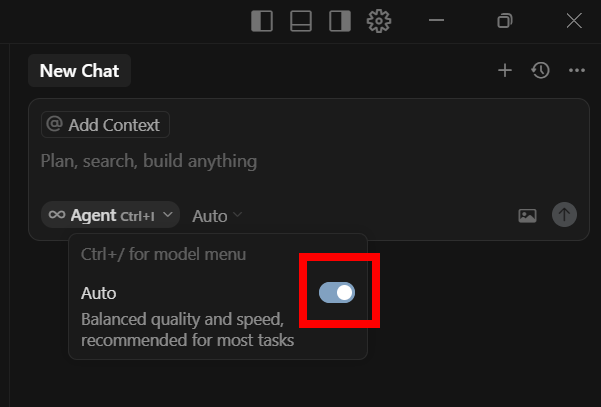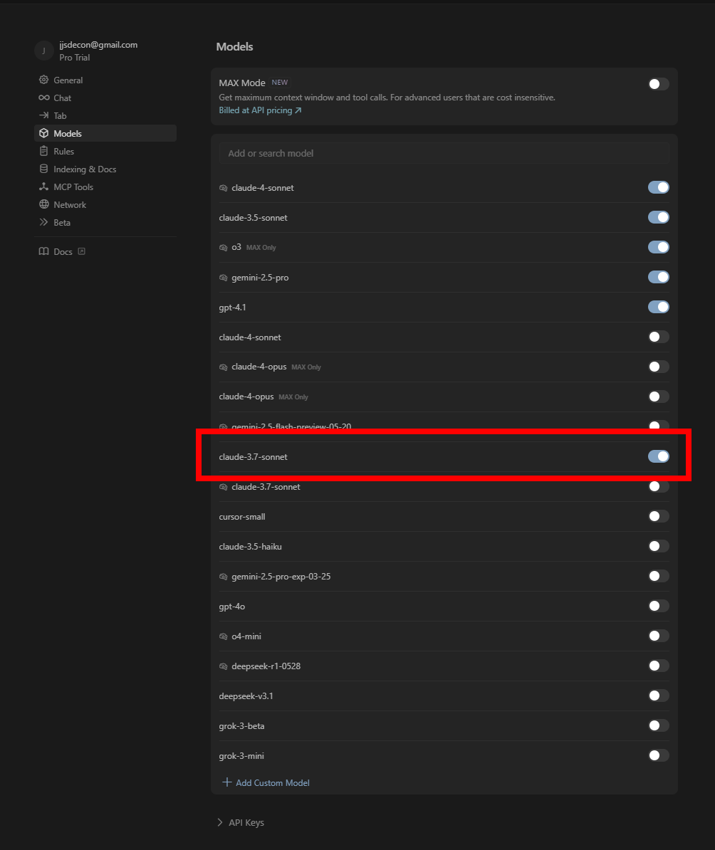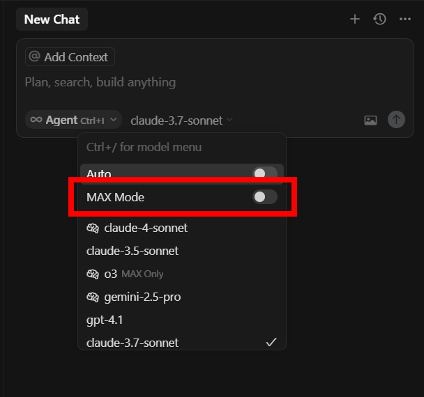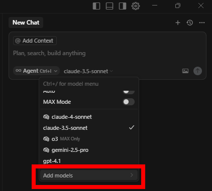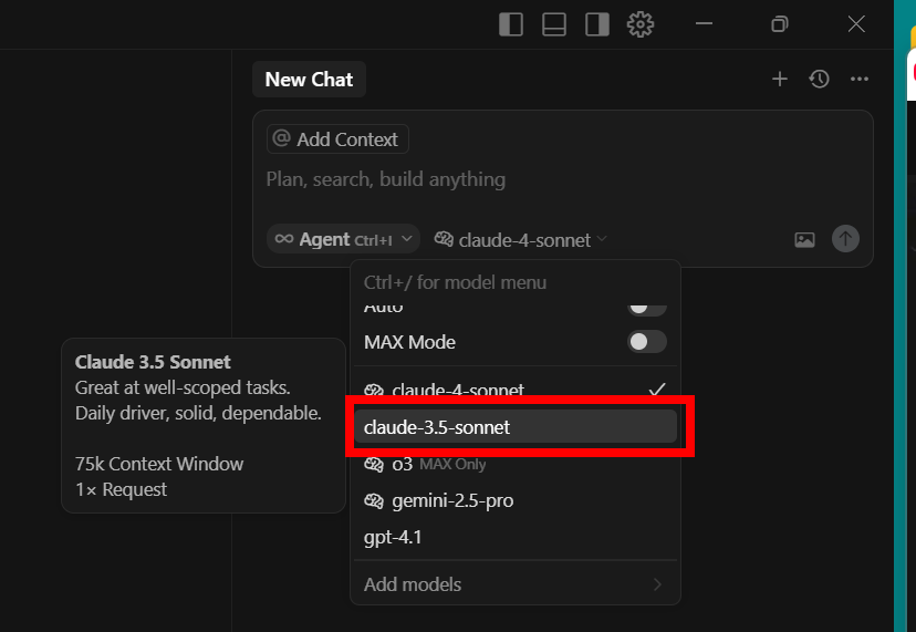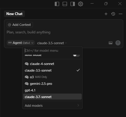 현재는 "Auto"로 설정이 되어 있지만, 저는 Claude-3.7-sonnet 을 선택하고 싶은데 없습니다.