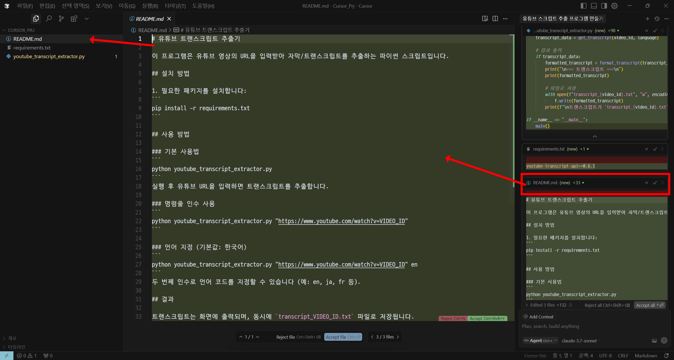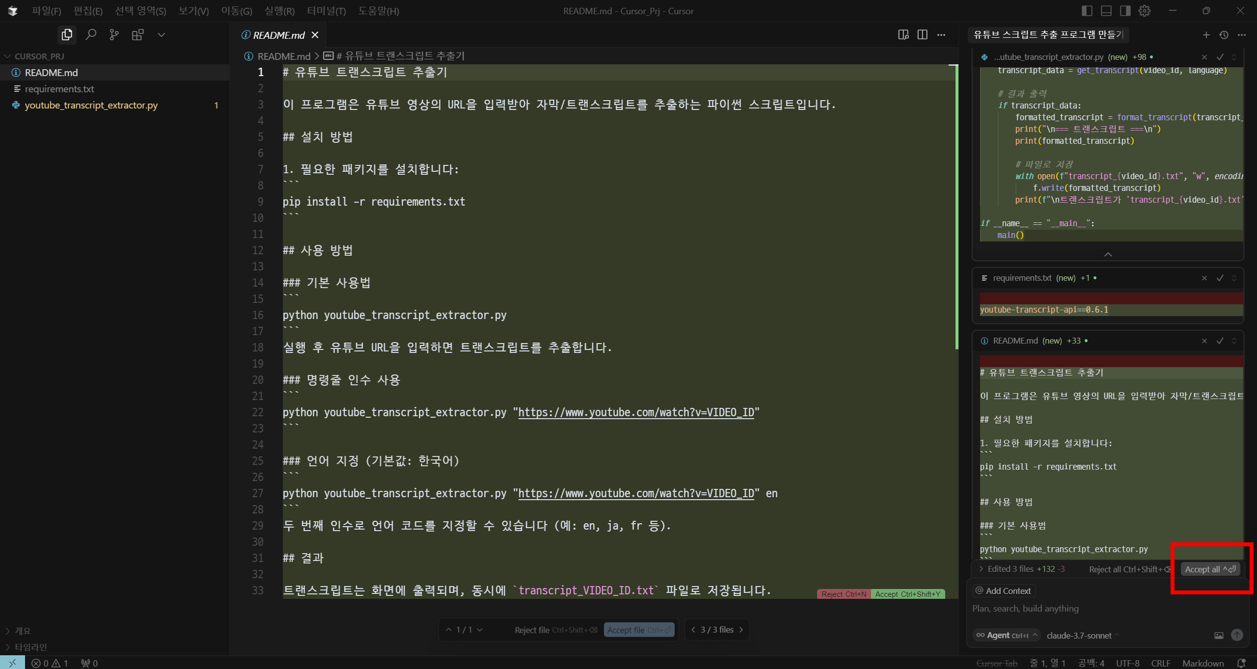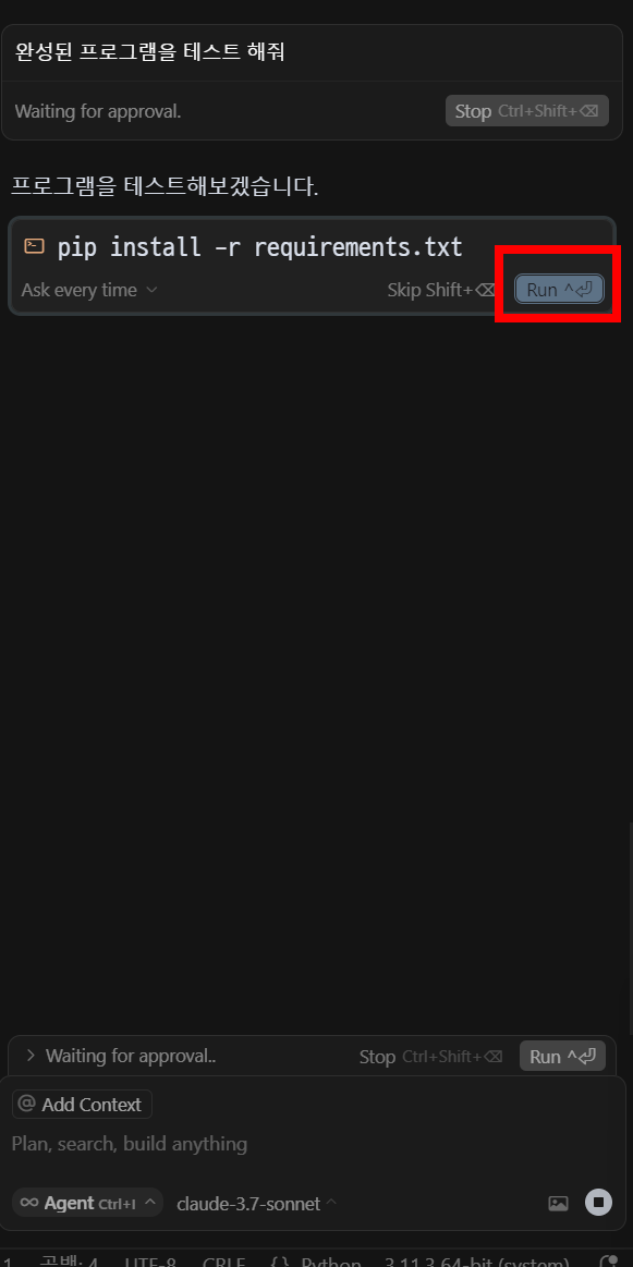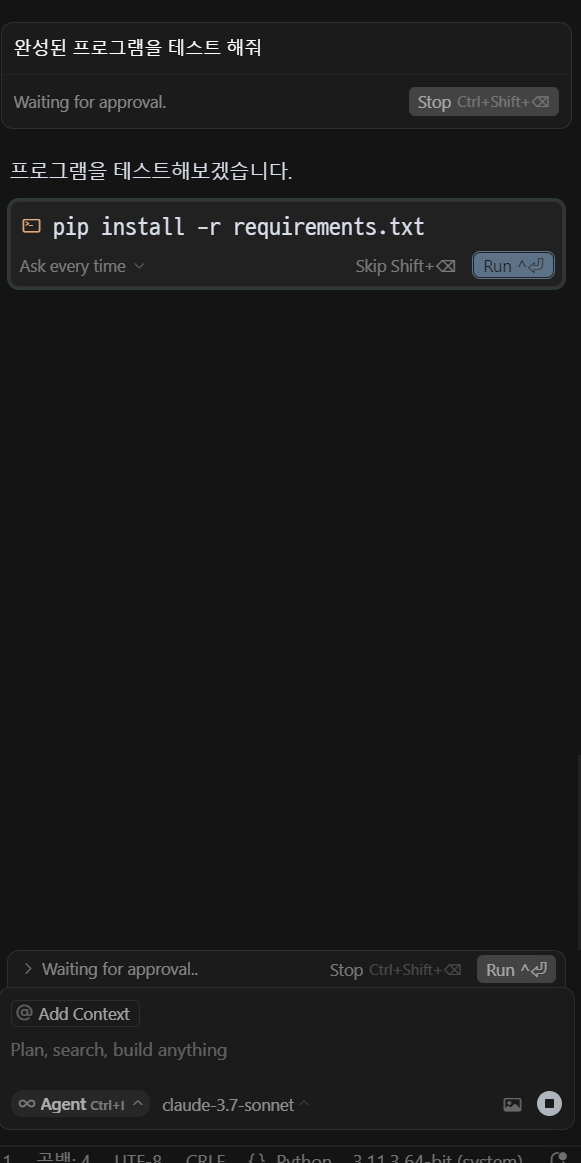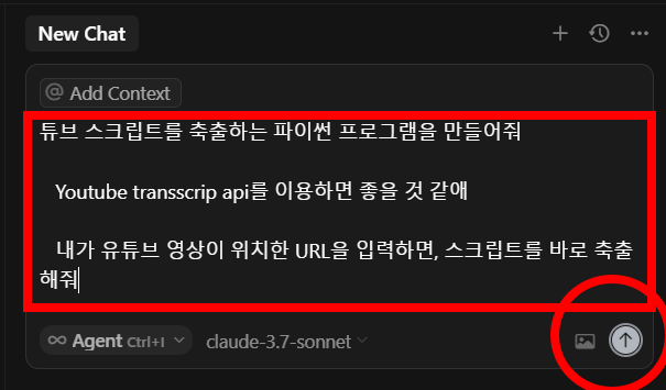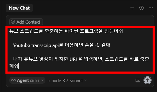 실제로 Cursor Ai 화면 채팅 창에 다음과 같이 입력한 후에