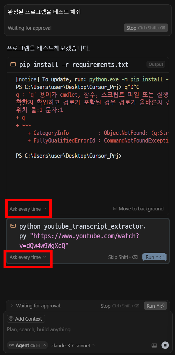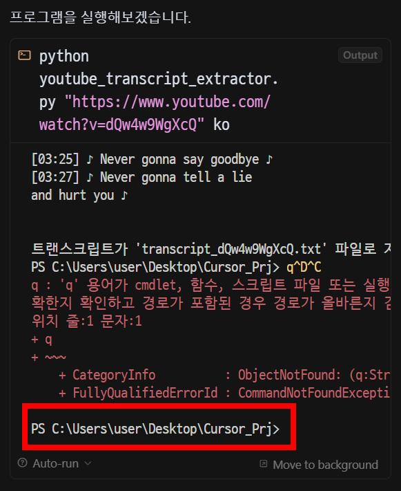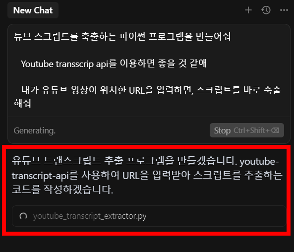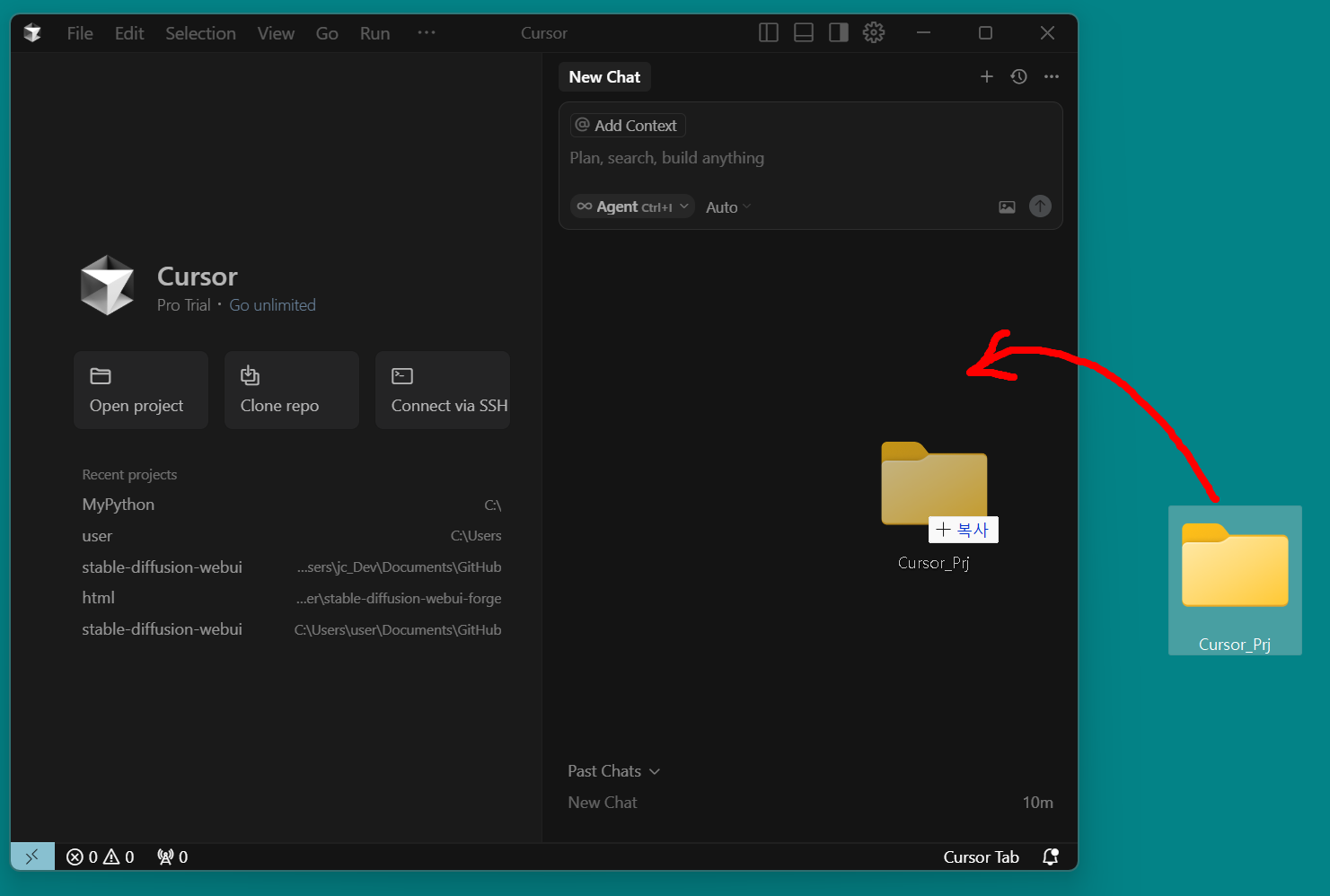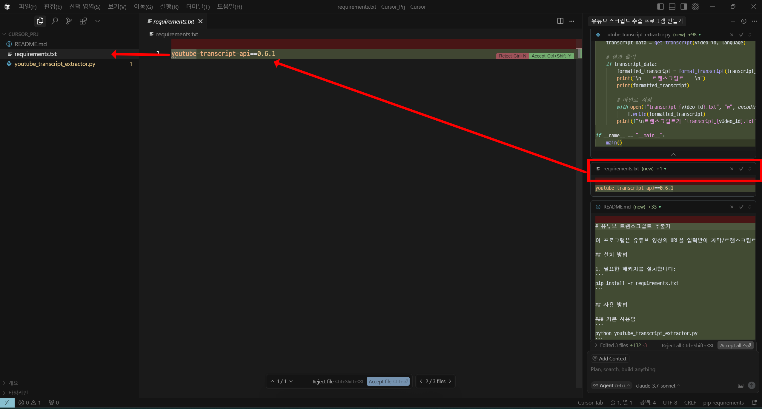 실제로 Cursor Ai 화면 채팅 창에 다음과 같이 입력한 후에