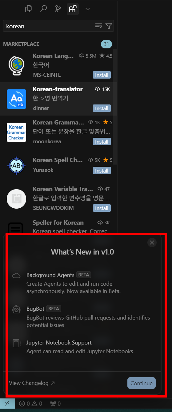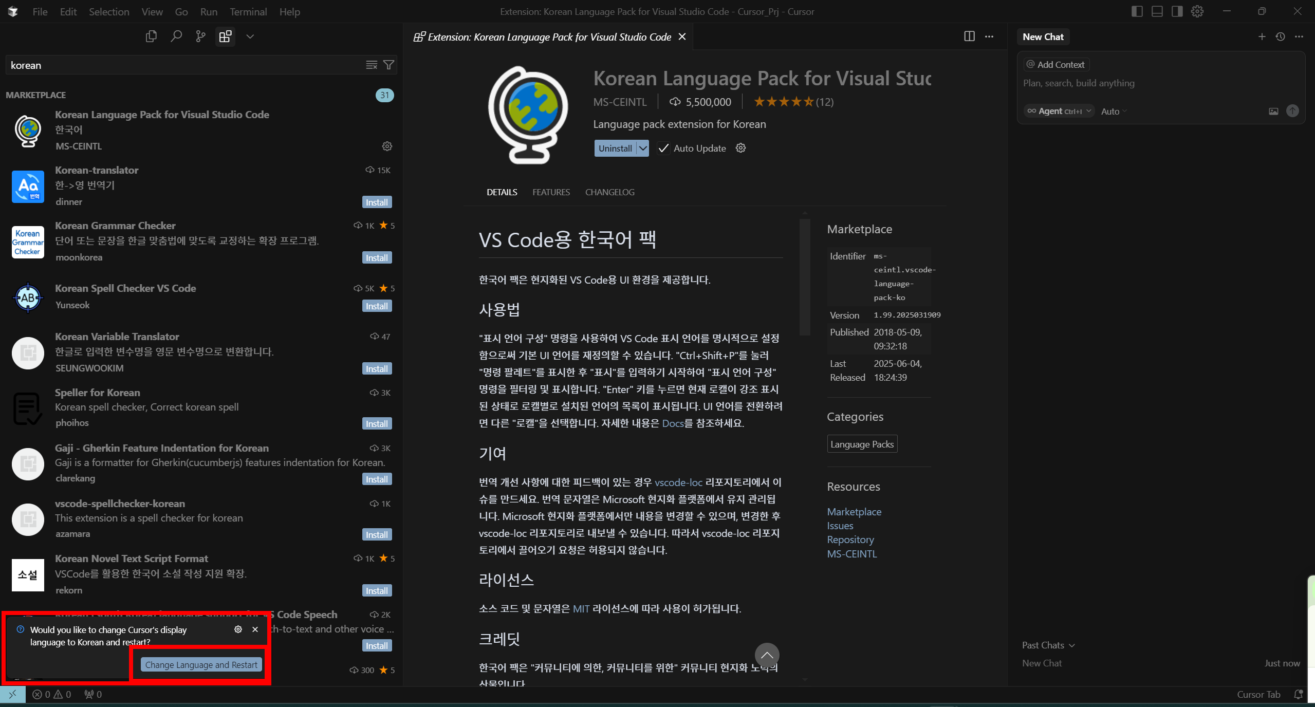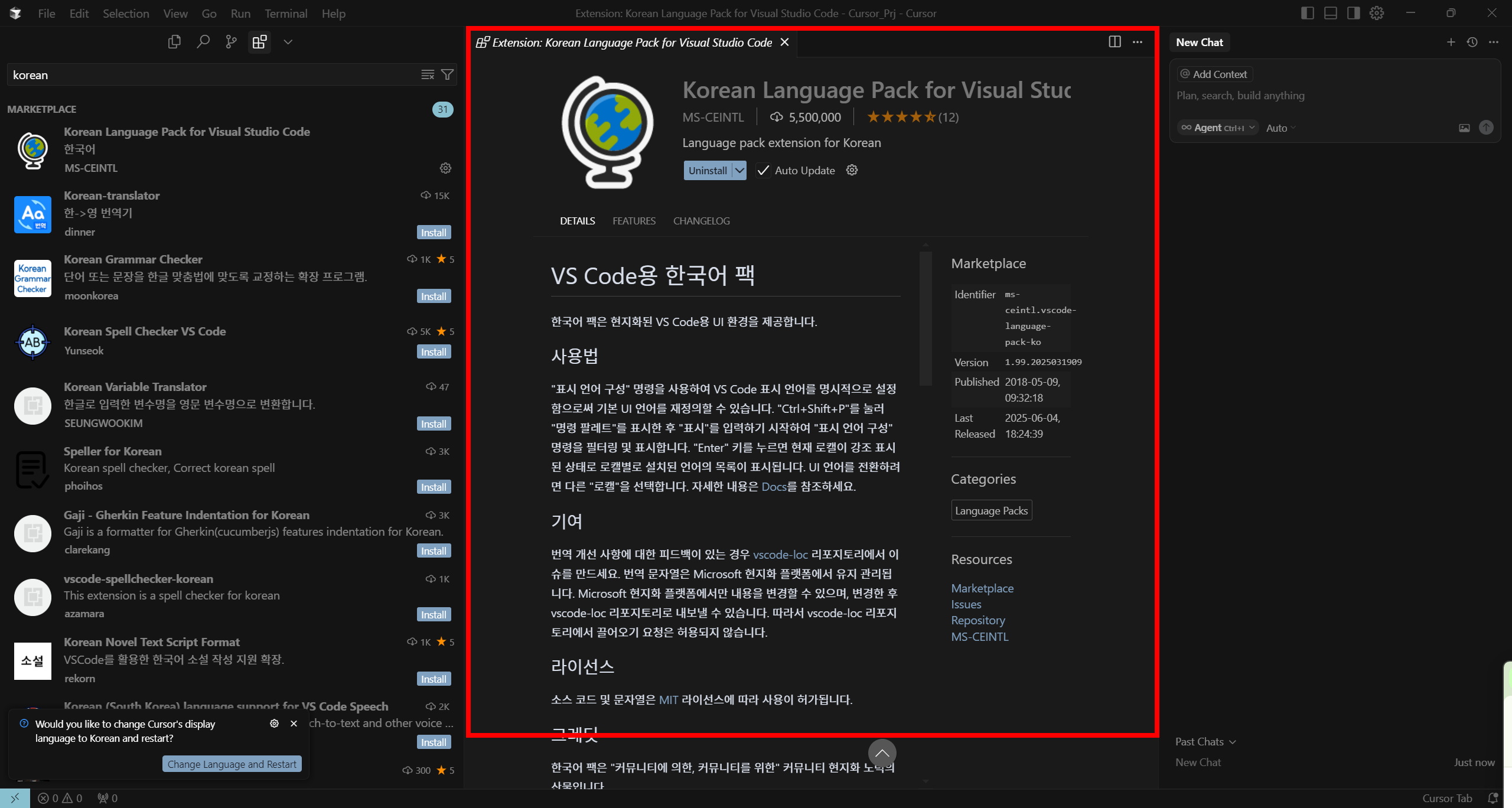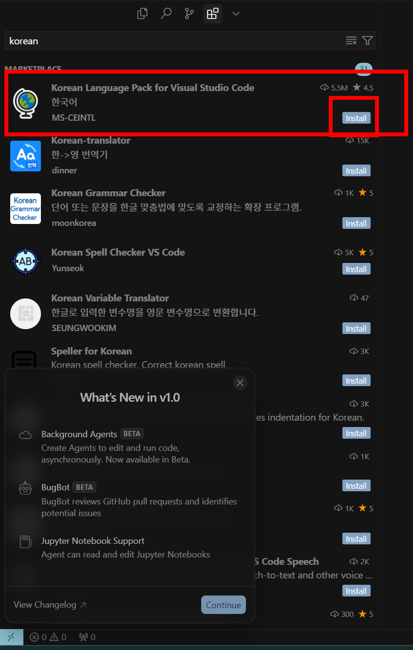 "Korean Language Pack for Visual Studio Code"가 보이면,